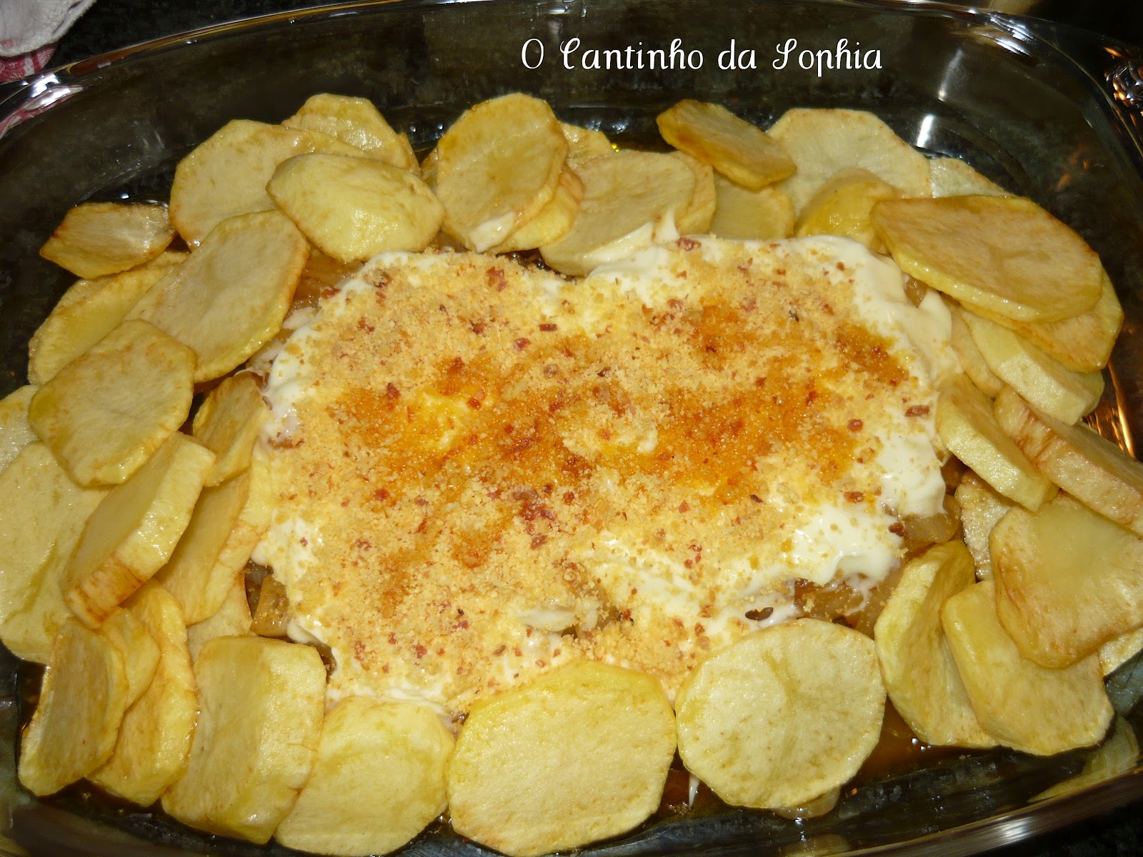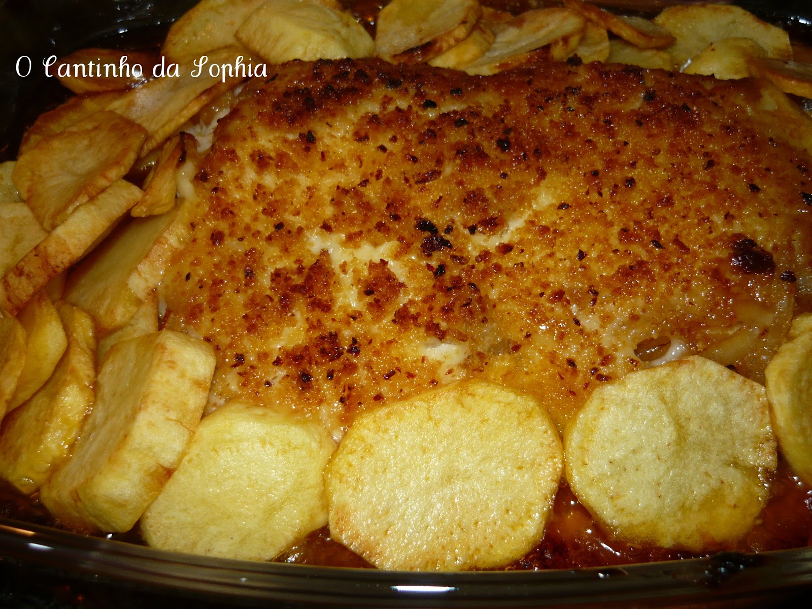 Dispus as batatas à volta das postas e levei ao forno a gratinar.