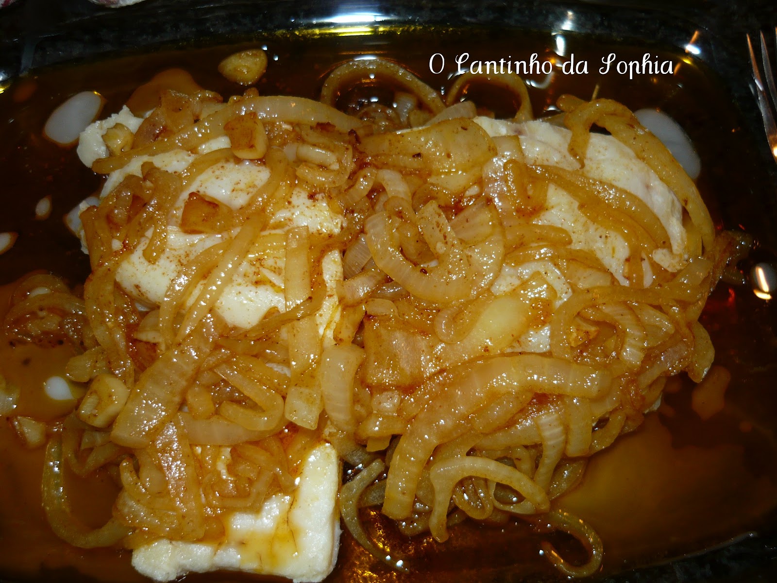 Assim que a cebolada ficou pronta, deitei sobre as postas do bacalhau.
